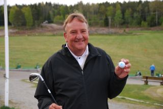 Bilde: Jan-Tore med ballen, køllen og et stort smil ved klubbhuset etter runden.
